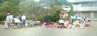 | 7時40分頃、折り返しエイドステーションに辿り着いた。ここでは写真にあるように色のついたビニール袋が置かれている。この袋には出発時に自分で用意した替えの服や靴下が入っており、食事をとり汗をふき復路に備えて半袖に着替えるのだ。帰りは下りが多く、膝の強いランナーはスピードを緩めずどんどん走って行く。私はあまり強い方ではないので歩くように走った。この地点に来ると後発のランナーとすれ違うようになるので、みんな挨拶をしながら走って行く。そしてこの坂を下り終わる頃には後発の早いランナー達にどんどん抜かれてしまう。彼等は一体どれくらいの練習をしているのか以前聞いたことがあるのだが、月300キロが目安になるらしく、それより上だとかなり気分よく走れるということだ。それ以上詳しくは聞かなかったが、自分では最高でも300いくかどうかといったところである。毎年、後発のランナーに抜かれる度に、もっと走っとけばよかった…と後悔するのである。 |
